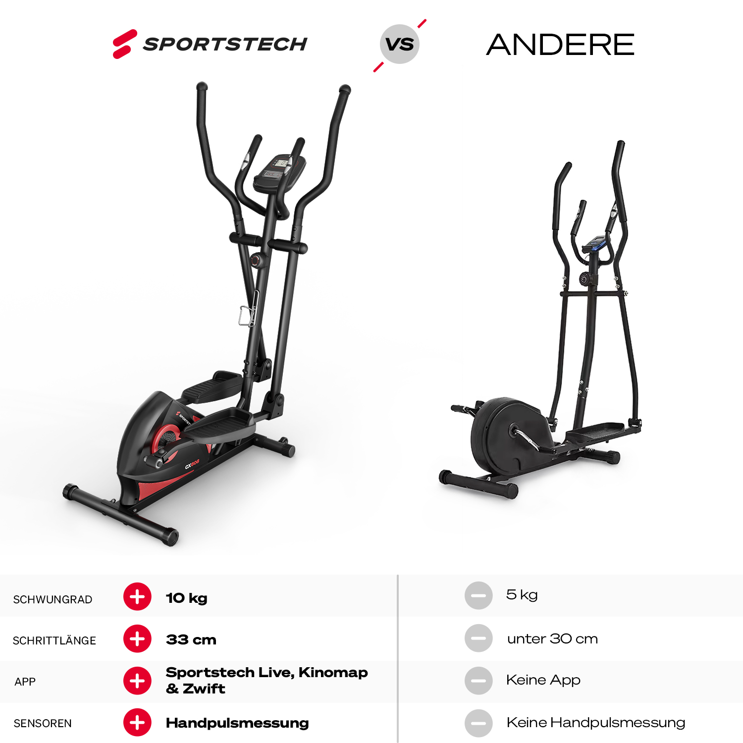Der Sportstech CX608 Crosstrainer verfügt über eine feste Schrittlänge von 33 cm, die für ein effektives und komfortables Trainingserlebnis sorgt. Diese Schrittlänge ist optimal abgestimmt, um eine breite Palette von Nutzern anzusprechen und gleichzeitig eine ergonomische Bewegung zu ermöglichen.