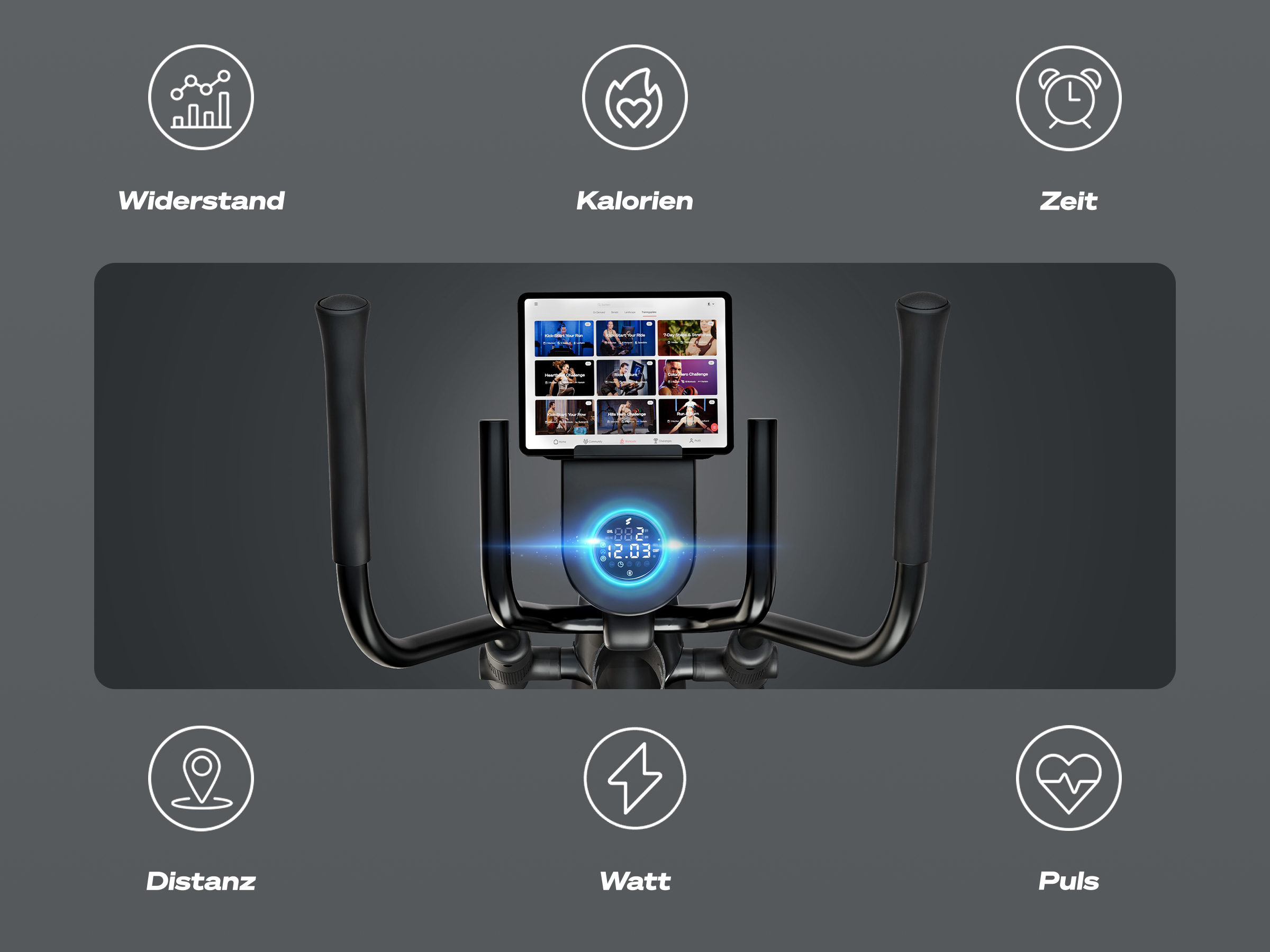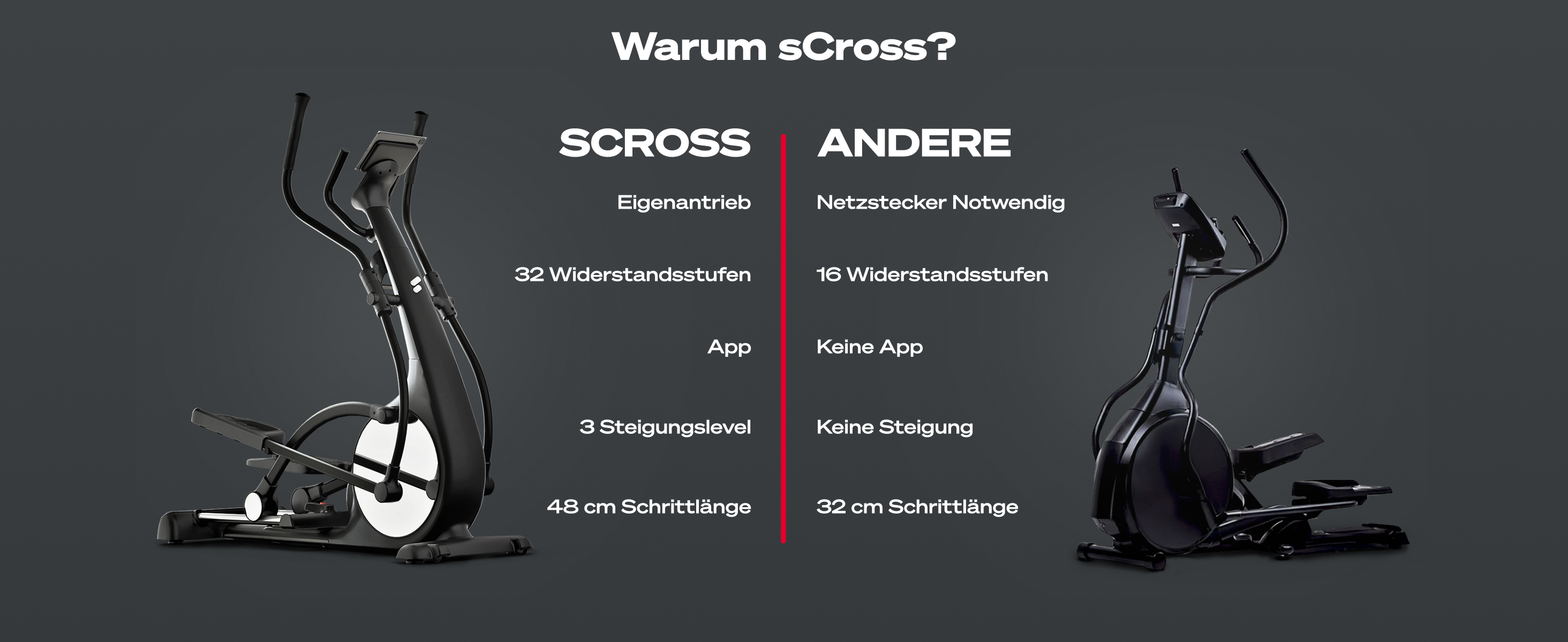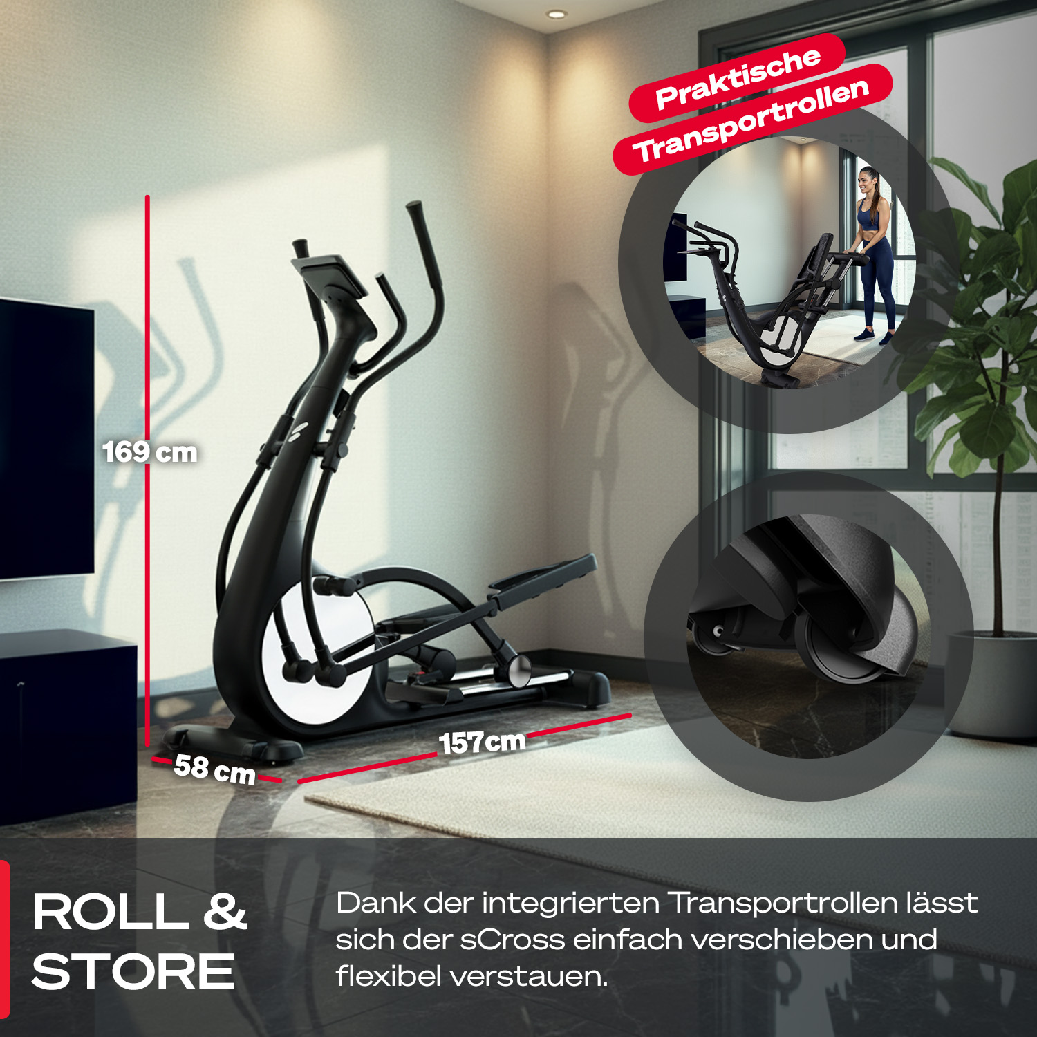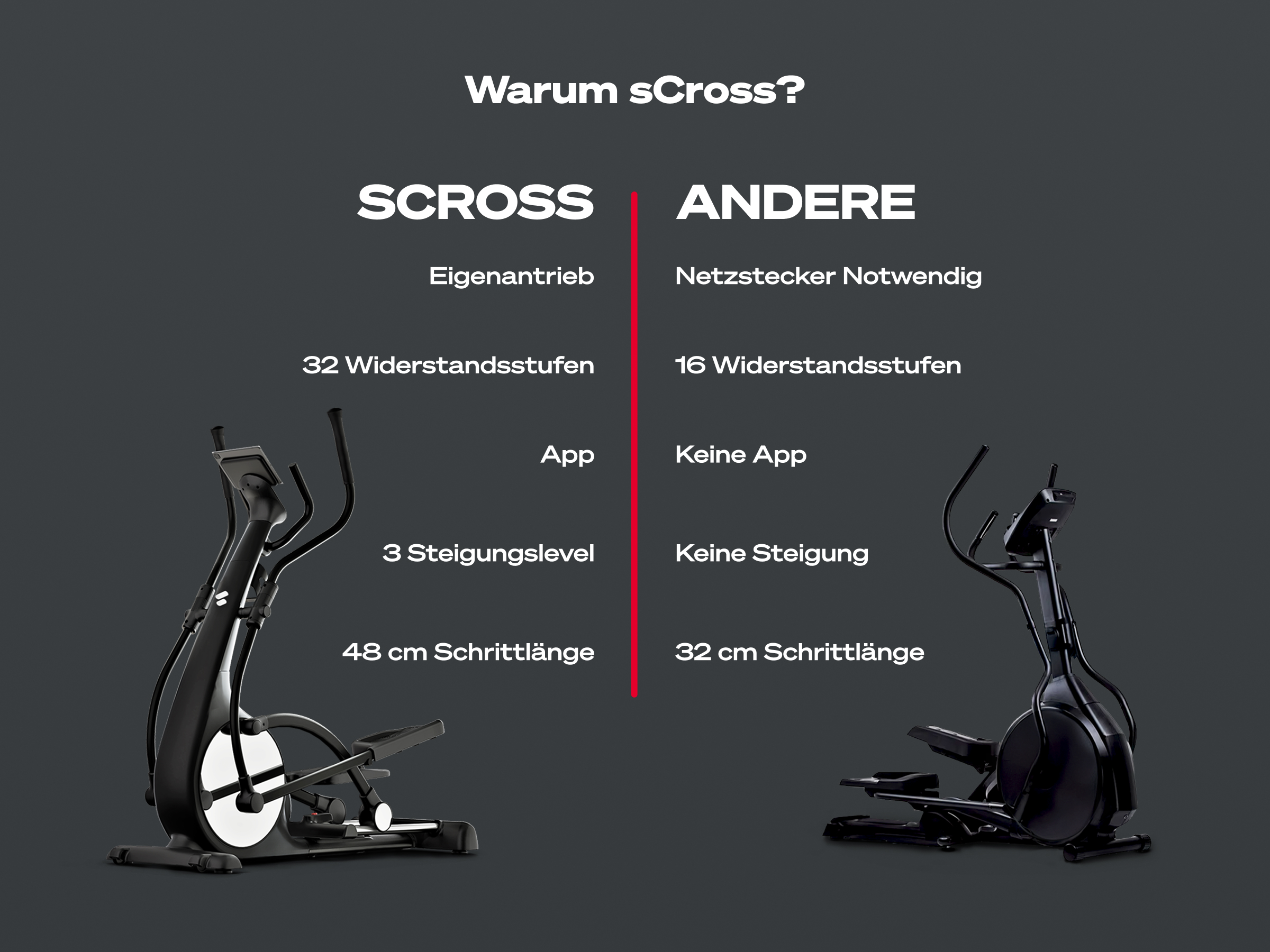 Der sCross verfügt über 32 elektronisch gesteuerte Widerstandsstufen. So lässt sich das Training perfekt an jedes Fitnesslevel anpassen – vom Aufwärmen bis hin zu intensiven Intervallen. Unterstützt wird das Training durch eine 6 kg Schwungradgewicht, die für einen gleichmäßigen und gelenkschonenden Bewegungsablauf sorgt.