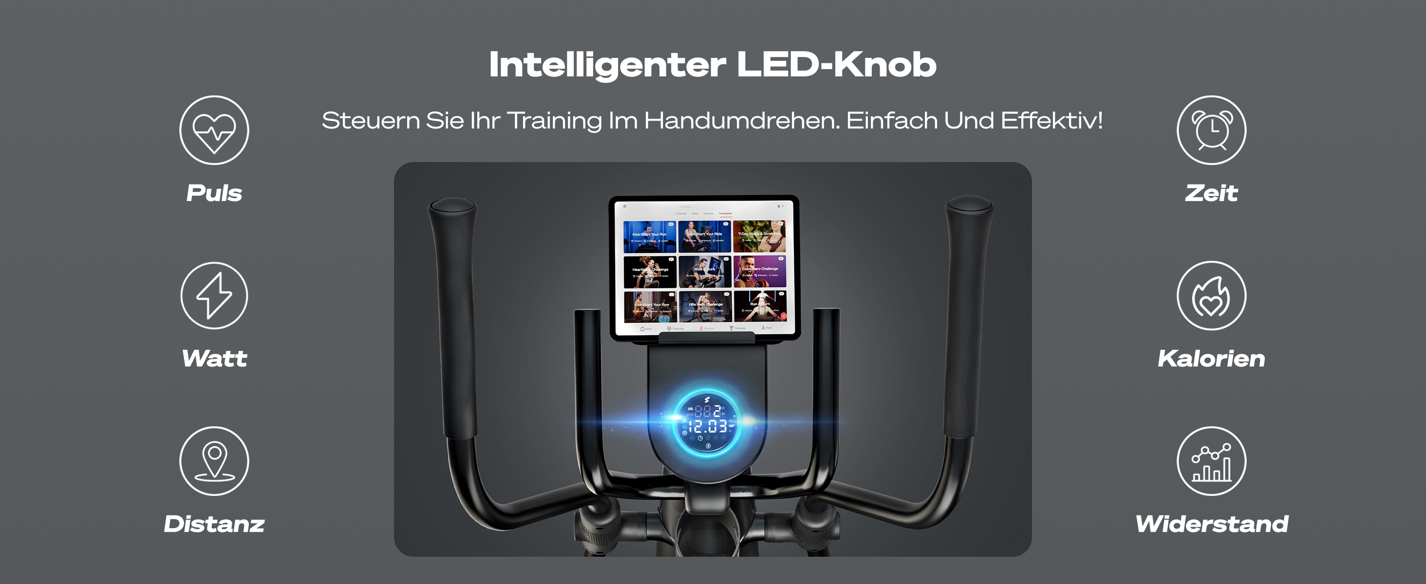 Das LED-Knob-Display des sCross zeigt alle wichtigen Trainingsdaten an, darunter Zeit, Distanz, Geschwindigkeit, Kalorienverbrauch, RPM, Watt, Puls sowie die aktuelle Widerstandsstufe. Die Bedienung erfolgt intuitiv über den zentralen Drehknopf.