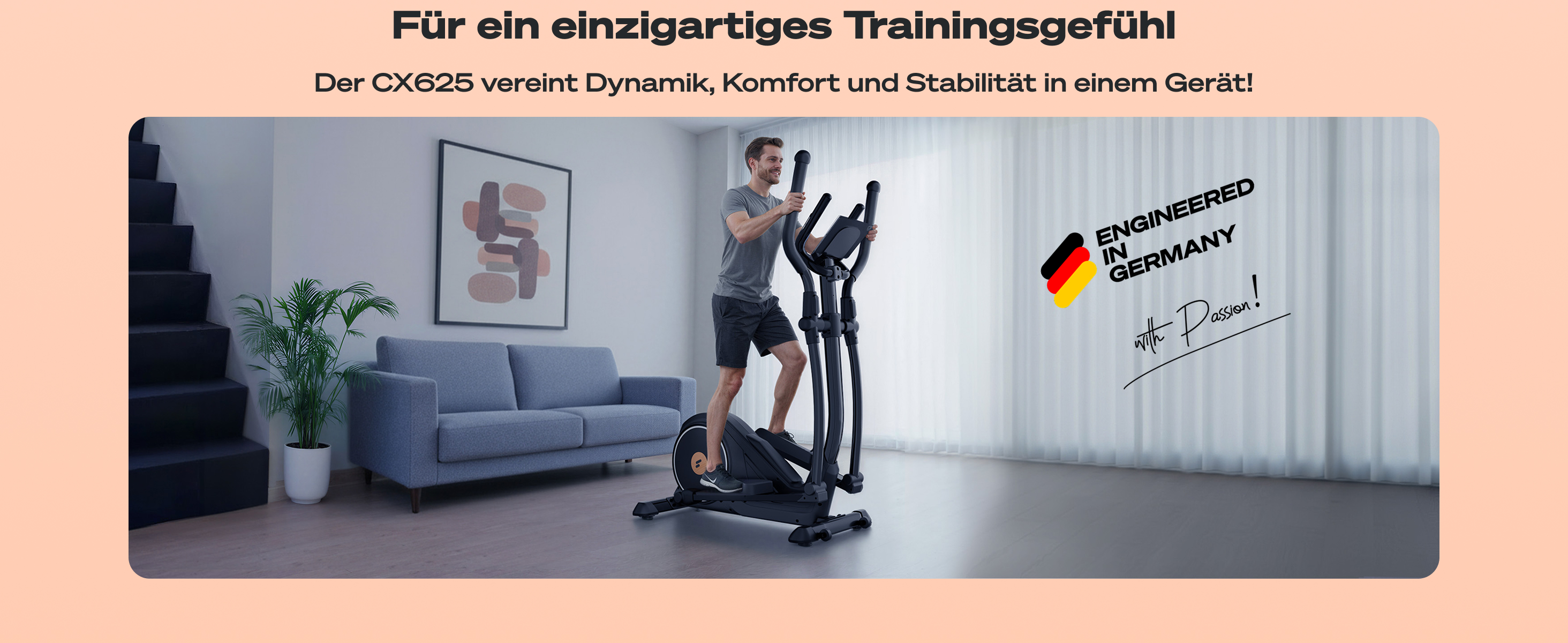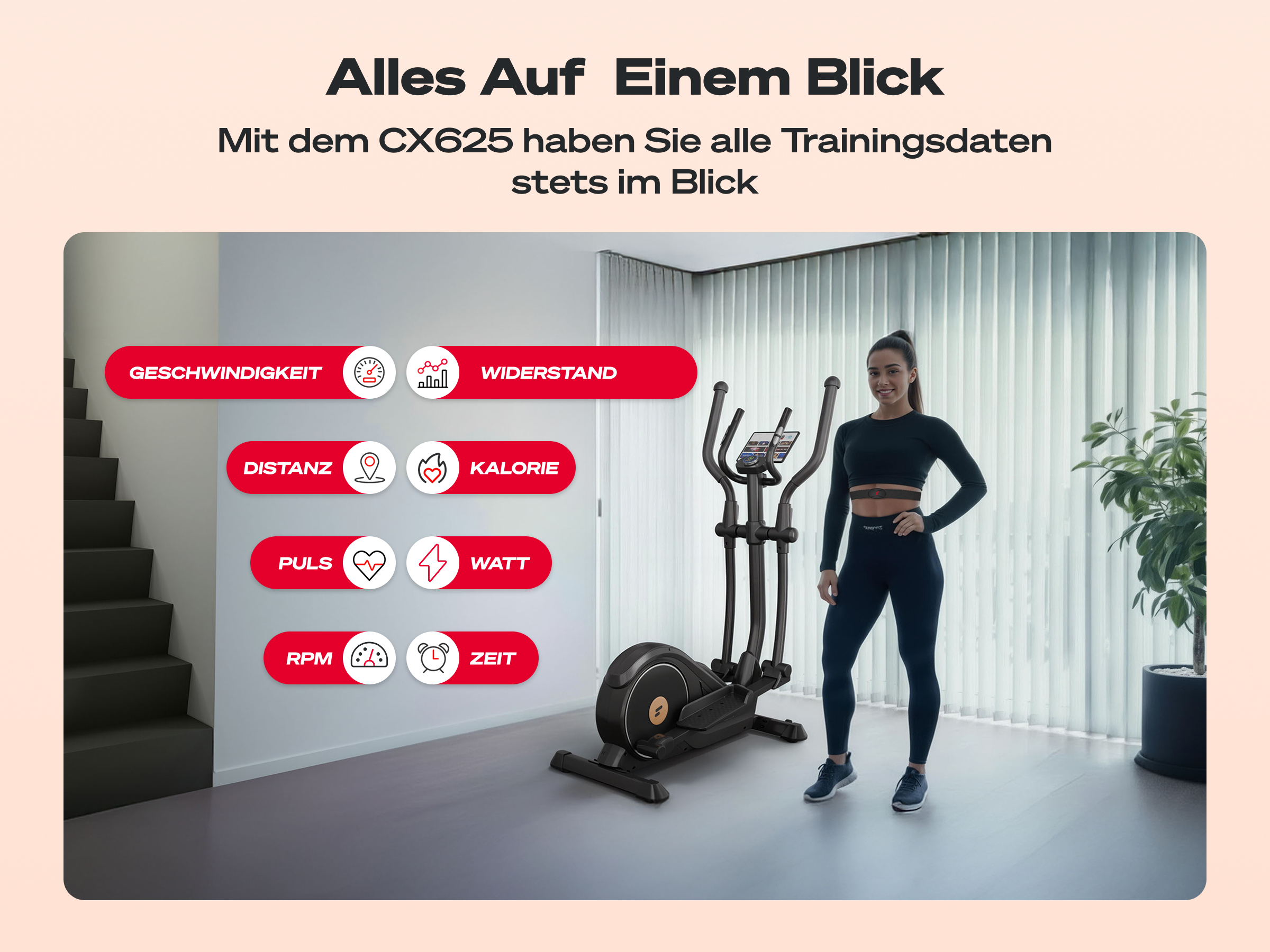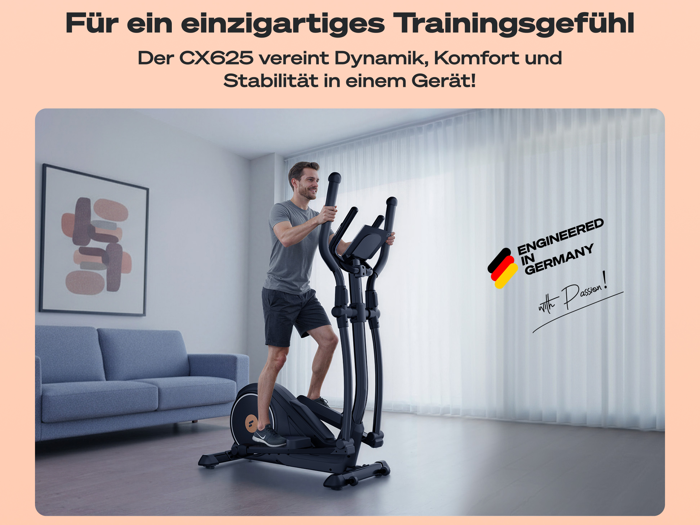 Der CX625 ist für Nutzerinnen und Nutzer mit einer Körpergröße von bis zu 1,85 m und einem maximalen Benutzergewicht von 120 kg geeignet. Damit bietet das Gerät eine stabile Basis für ein komfortables und effektives Training.
