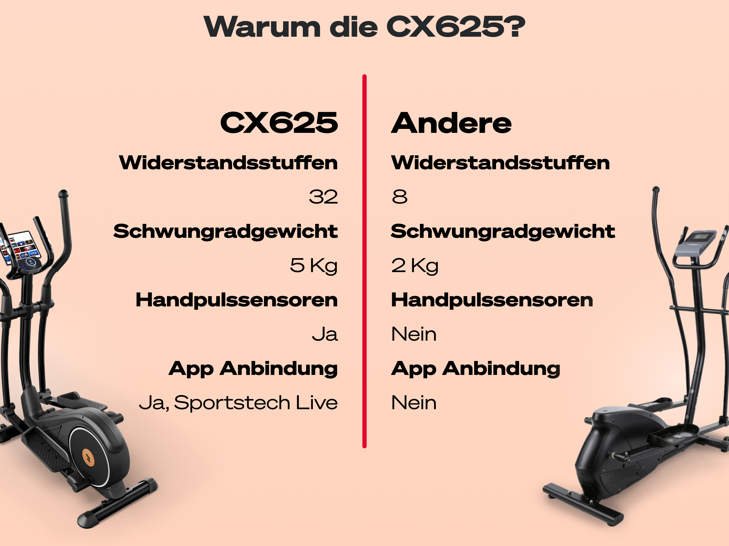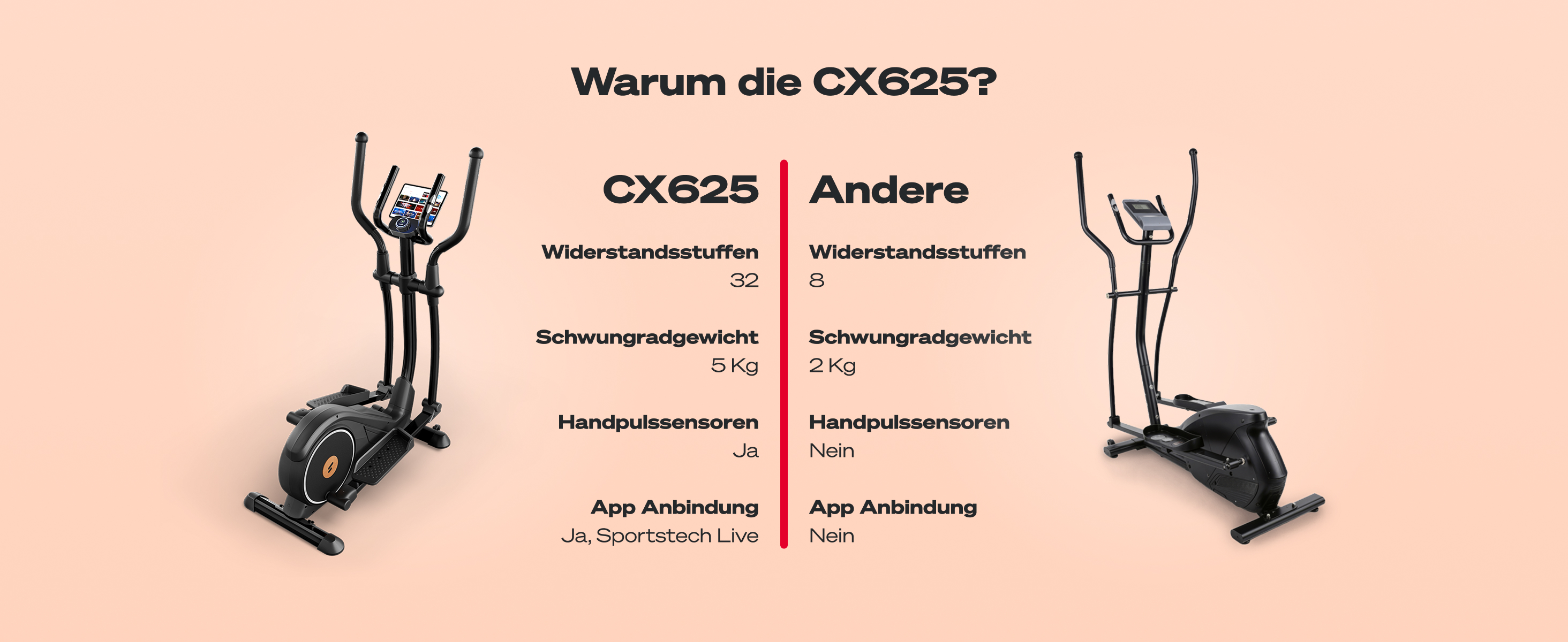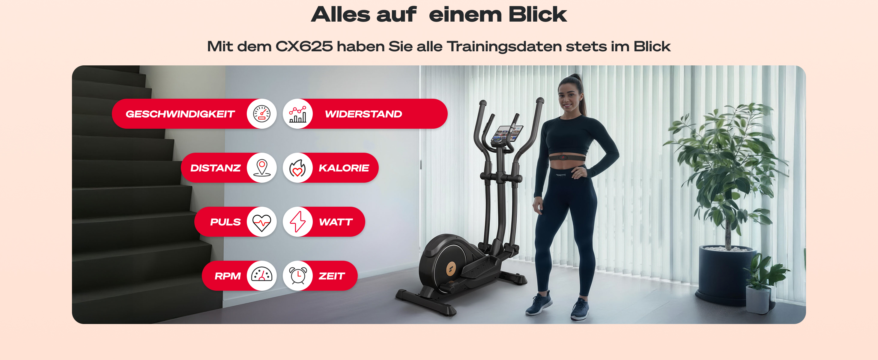 Der CX625 ist für Nutzerinnen und Nutzer mit einer Körpergröße von bis zu 1,85 m und einem maximalen Benutzergewicht von 120 kg geeignet. Damit bietet das Gerät eine stabile Basis für ein komfortables und effektives Training.