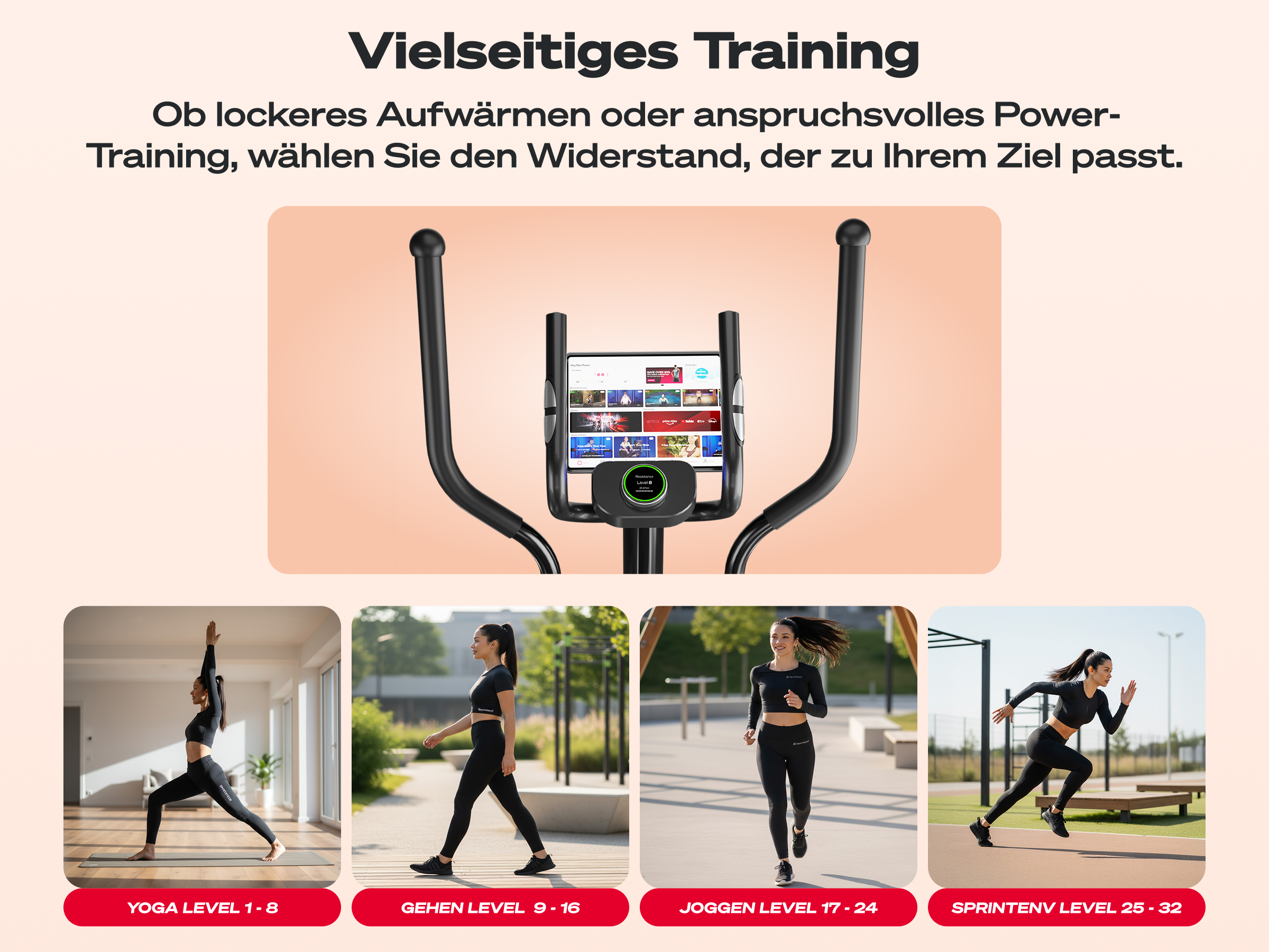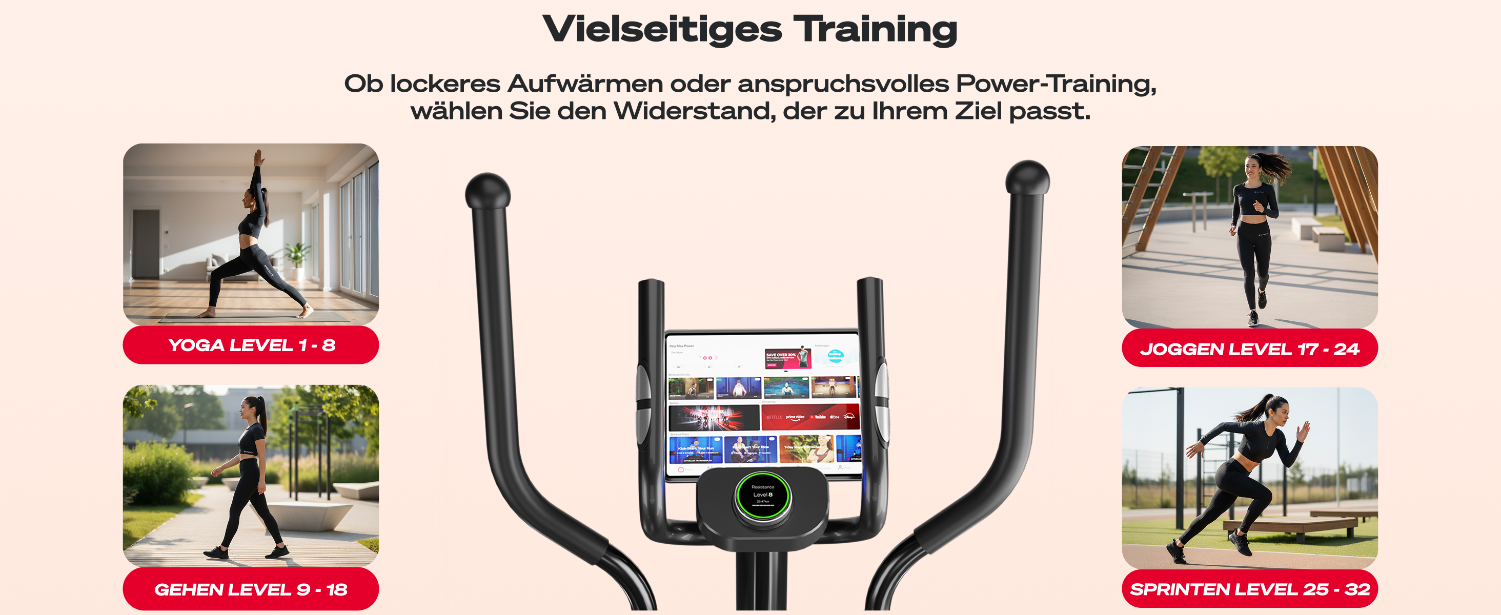 - Leises Magnetbremssystem mit 32 Widerstandsstufen