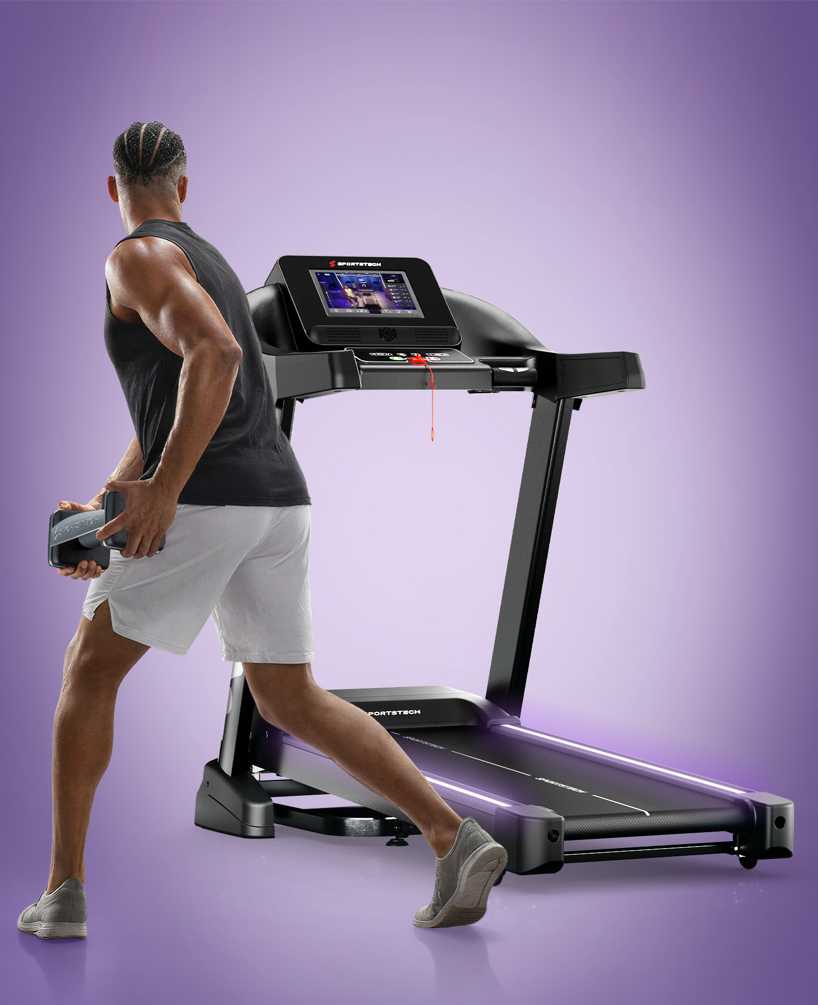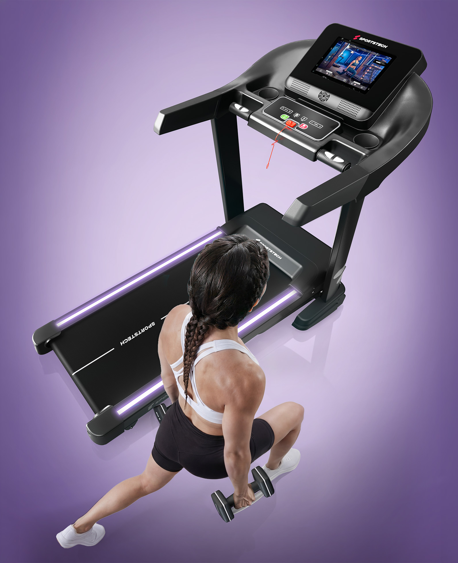 - Touchscreen: Integrierter 10,1"-Touchscreen für intuitive Bedienung und interaktives Training direkt am Laufband.