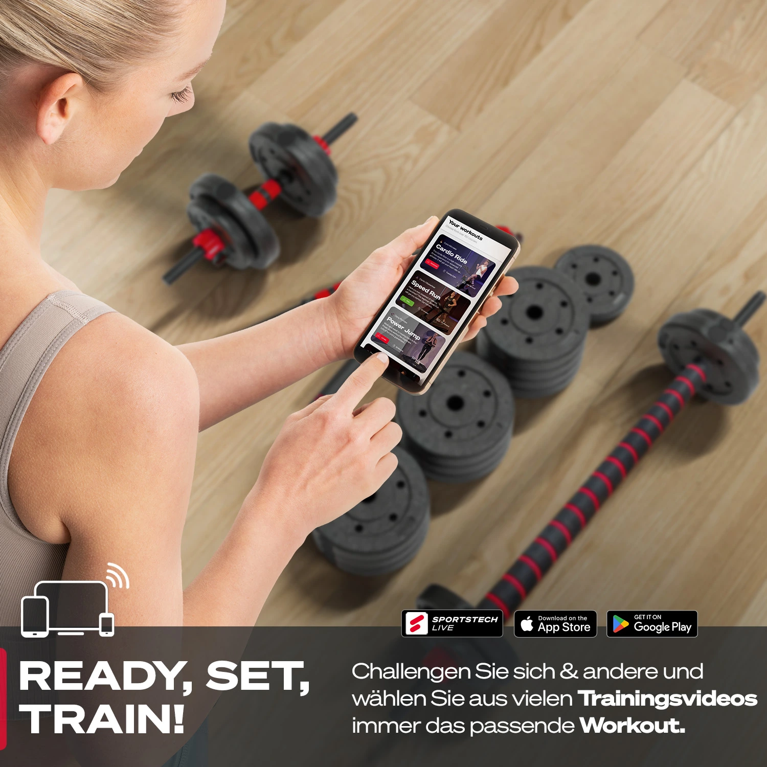Kaum eine Trainingsart ermöglicht einen derart schnellen und effizienten Aufbau der Körpermuskulatur wie Freihantel-Workouts, bestenfalls in Kombination aus Kurz- und Langhanteltraining. Die Auswahl der möglichen verschiedenen Übungen ist immens, stahlharte Muskeln sind das Ergebnis. Das AH150 Hantelset von SPORTSTECH bietet beides. Die Kurzhanteln lassen sich durch das stabile Mittelstück schnell in eine Langhantel umwandeln. Das Beste: Dank bis zu 40 kg Gewichten sind deinem Muskelzuwachs mit den AH150 Hanteln 2in1 keine Grenzen gesetzt.