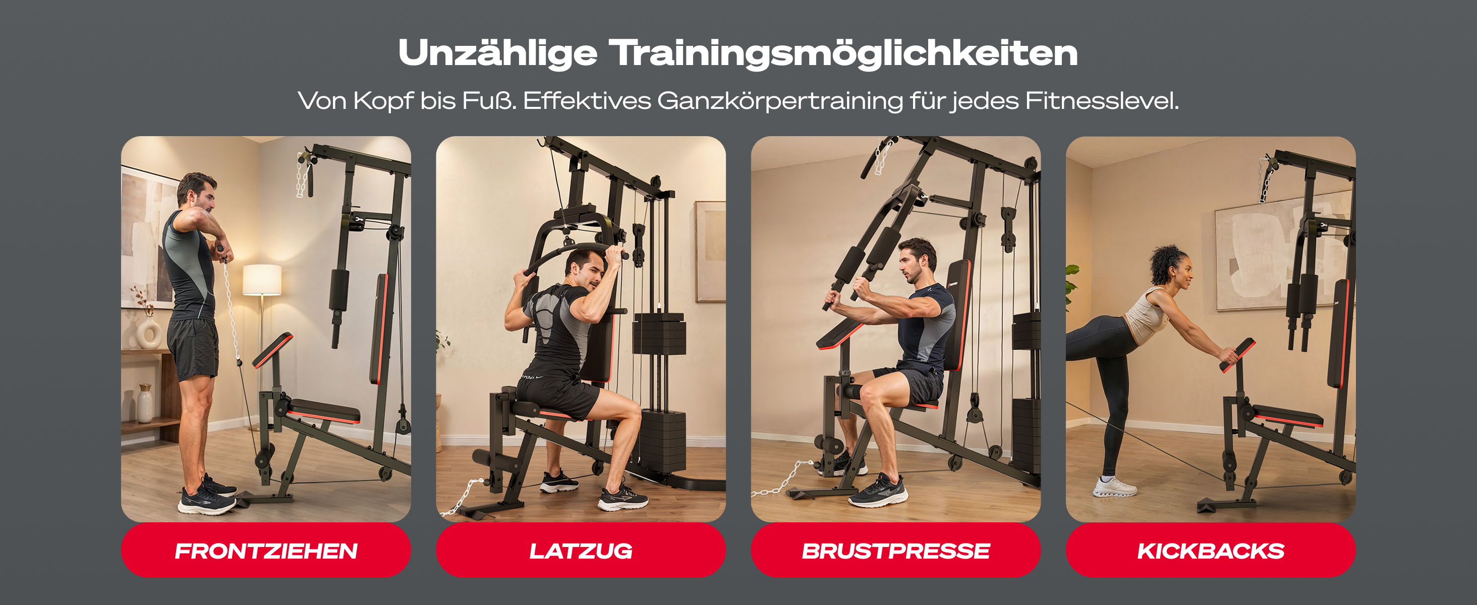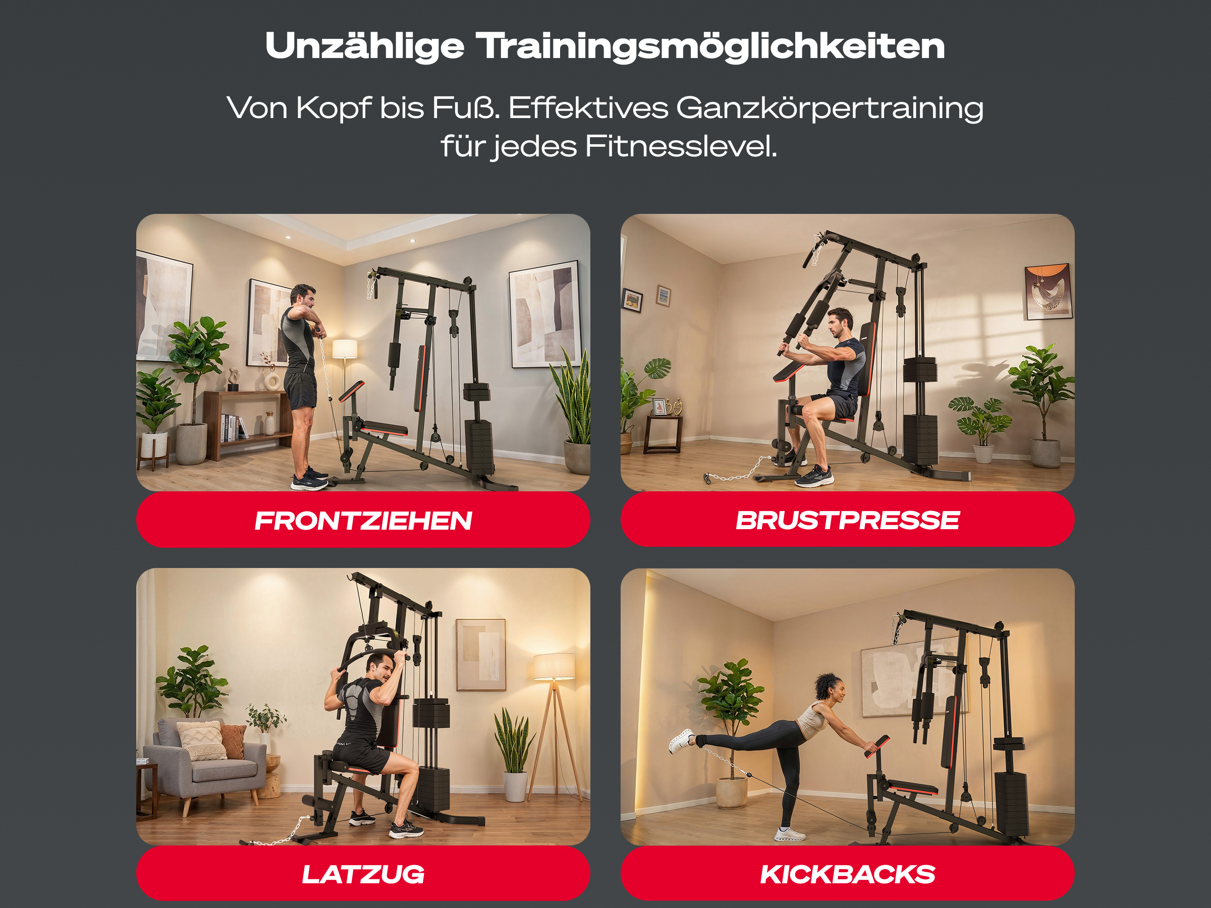 - 40+ Übungen am Seilzug wie Rudern, Bankdrücken, Latzug, Beinstrecker