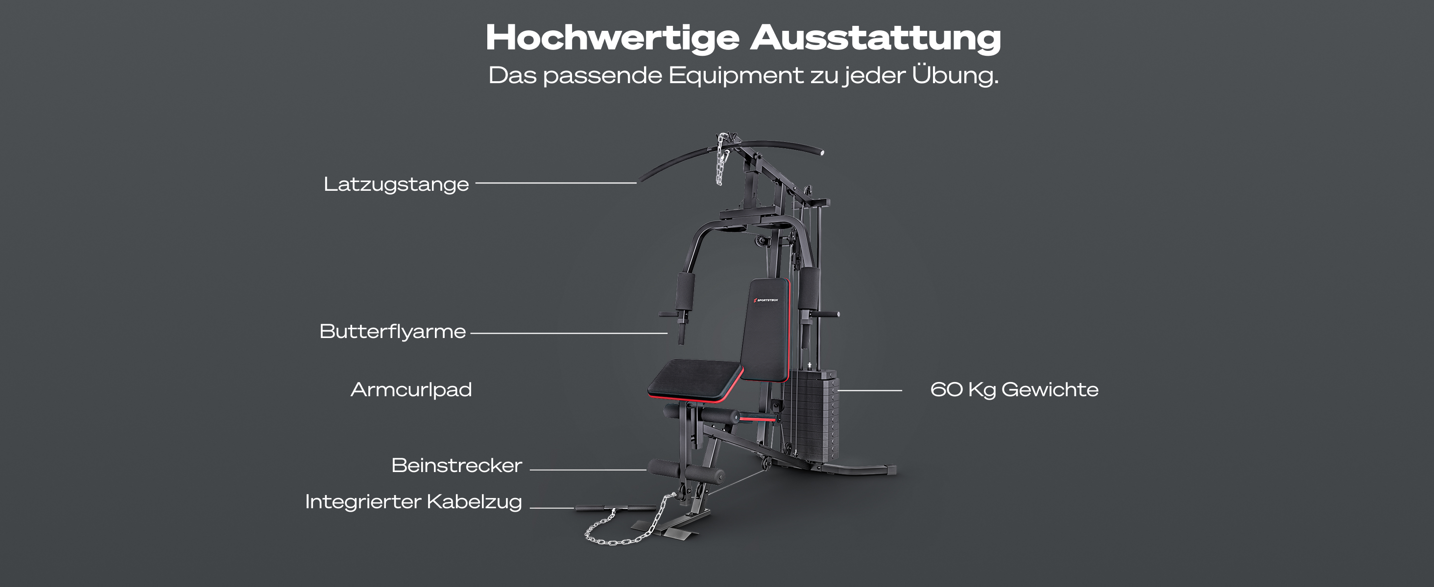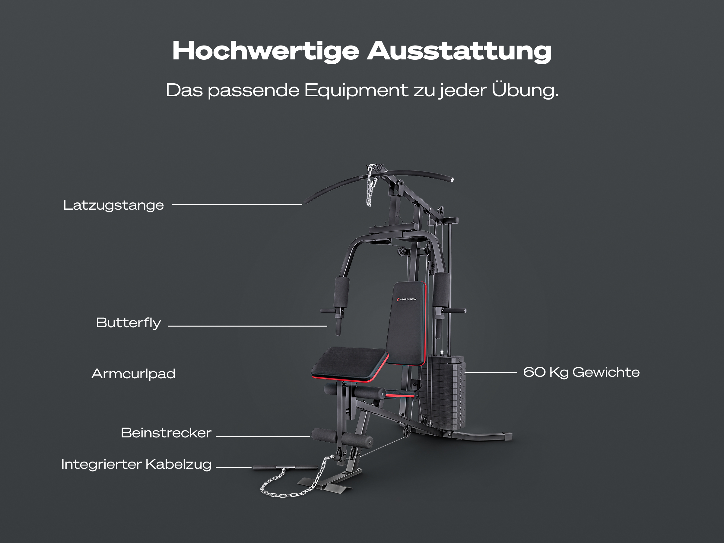 - Umfangreiche Ausstattung mit Lastzugstange, Bizepscurl-Pad, Beinstrecker und Butterflyarmen