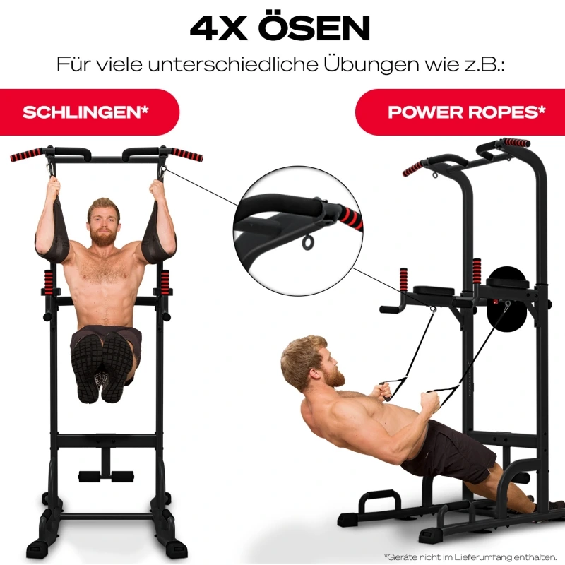 7 in 1 Kraftturm mit Klimmzugstange, Liegestützgriffe & Ösen für TRX, Ropes, Schlingen
