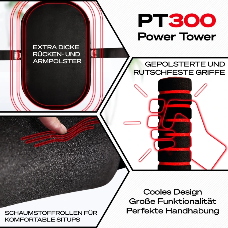 Wer würde nicht gern jeden Tag ein abwechslungsreiches Training absolvieren, statt sich auf nur ein Sportgerät und wenige Übungen festzulegen? Eine starke Routine im Training setzt irgendwann keine neuen Muskelreize mehr und kann demotivieren. Die PT300 Dip Station vereint durch ihre intelligente Konstruktion unzählige Trainingsmöglichkeiten - ciao Langeweile! Dazu kommt die hochwertige Ausstattung mit extradicken, atmungsaktiven Rücken- und Armpolstern, bequemen Schaumstoffrollen sowie rutschfesten Griffen für ein Workout mit idealem Komfort.
