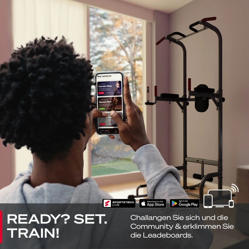 Das Besondere an unserem Fitness Tower? Die integrierte Klimmzugstange ist um 180° drehbar, sodass deinen intensiven Klimmzügen nichts im Wege steht! Um mehr über das korrekt ausgeführte, effektive Training des Oberkörpers zu erfahren, bietet das inbegriffene E-Book eine ganze Menge an Informationen und Inspiration. Auf diese Weise profitieren sowohl Beginner als auch Profis von wertvollen Tipps und können jedes Training abwechslungsreich gestalten, um regelmäßig neue Muskelreize zu setzen. Auf zur nächsten Challenge - mit SPORTSTECH!