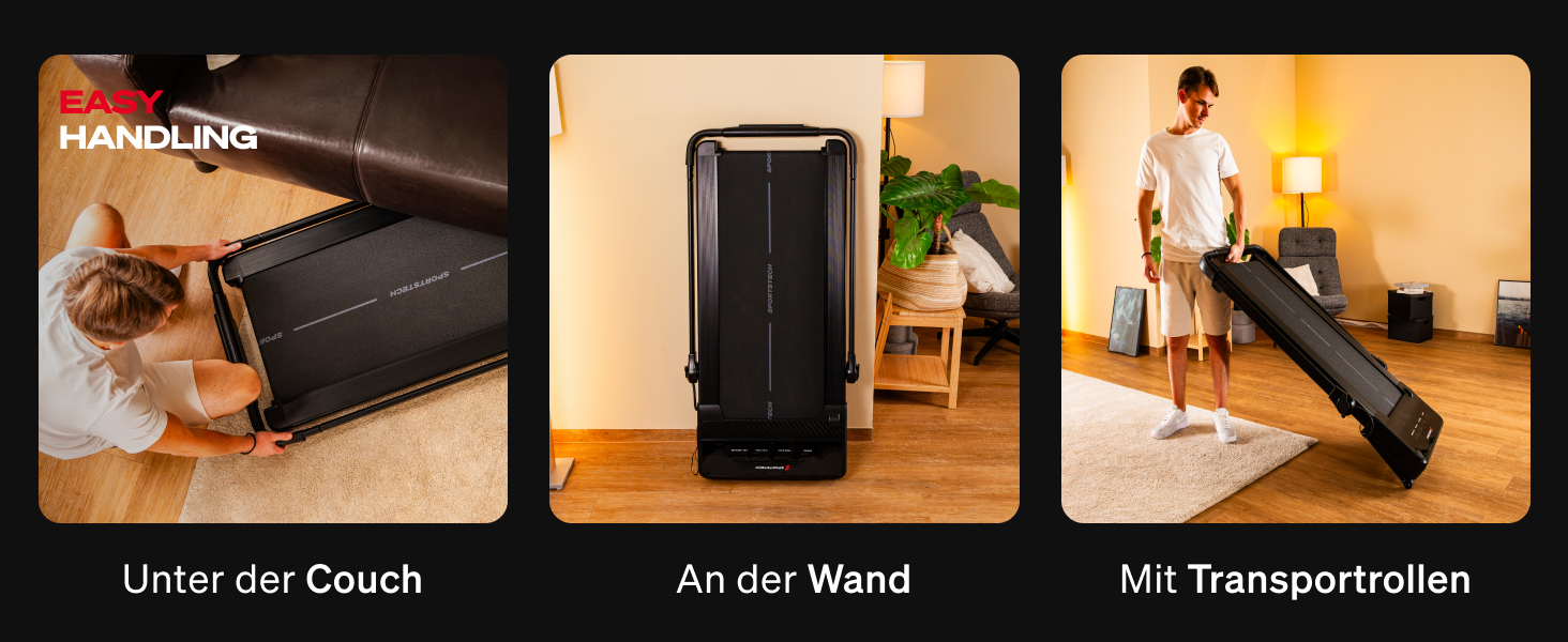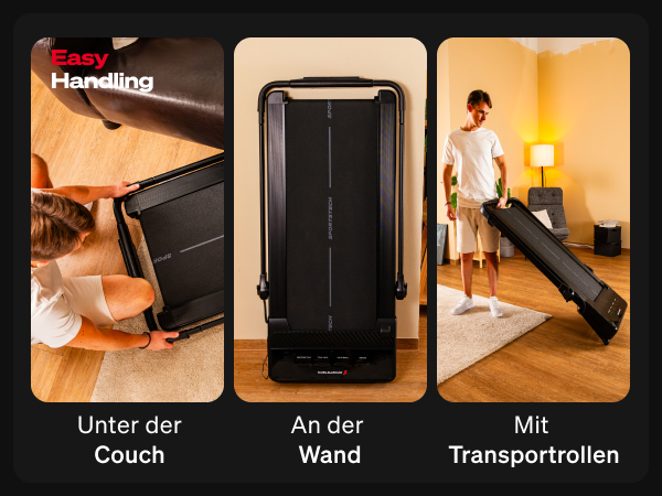 Dank seines kompakten Designs und der integrierten Transportrollen lässt sich das Laufband problemlos bewegen und verstauen: