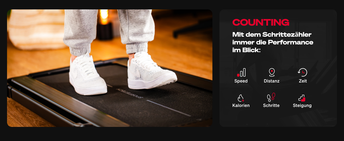 Das sPad1000 ermöglicht Geschwindigkeiten von 1 bis 12 km/h, wodurch es sowohl für Walking als auch für intensives Lauftraining geeignet ist.