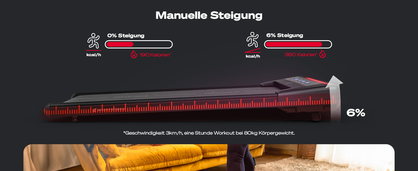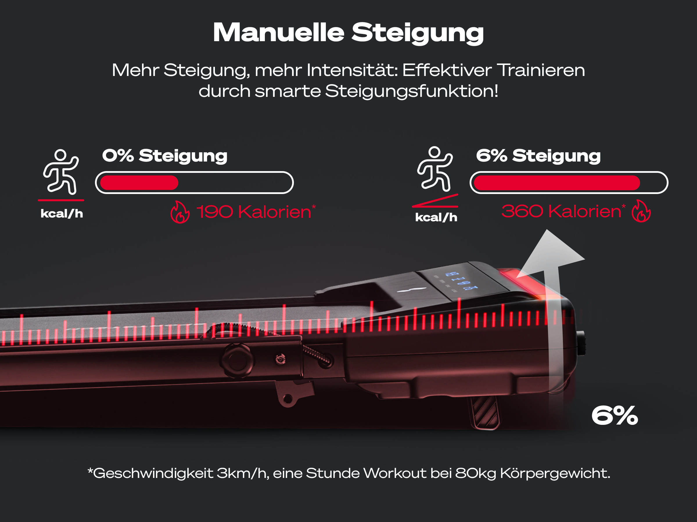 Ja, das Walking Pad verfügt über eine manuelle Steigung von 6 %, die das Training intensiviert. Die Steigungsbügel sind vorne unter dem Motor angebracht und müssen manuell ausgeklappt werden.