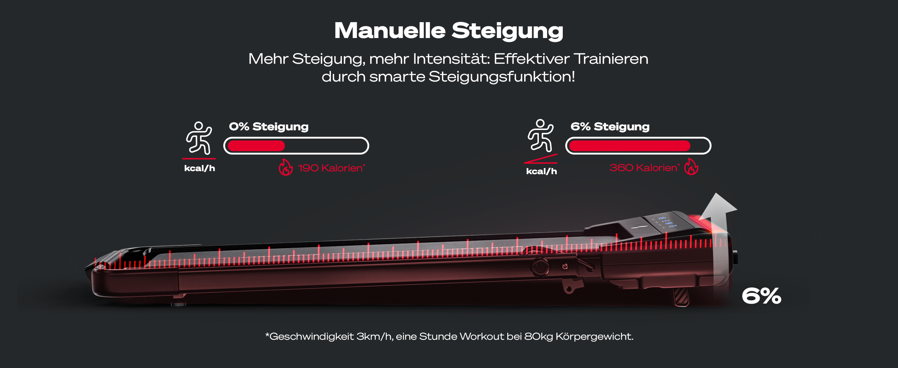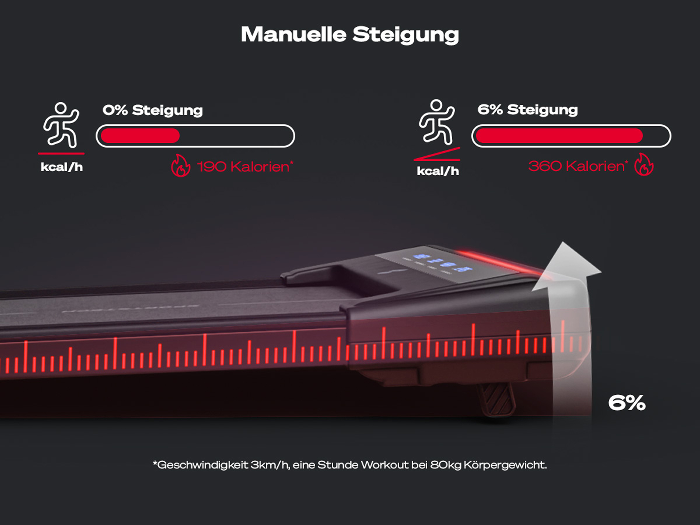 Ja, das sWalk Lite Plus bietet eine Steigung von 11,5 %, die das Training intensiver macht. Die Steigungsbügel befinden sich vorne unter dem Motor und müssen manuell ausgeklappt werden, um die Steigung einzustellen.