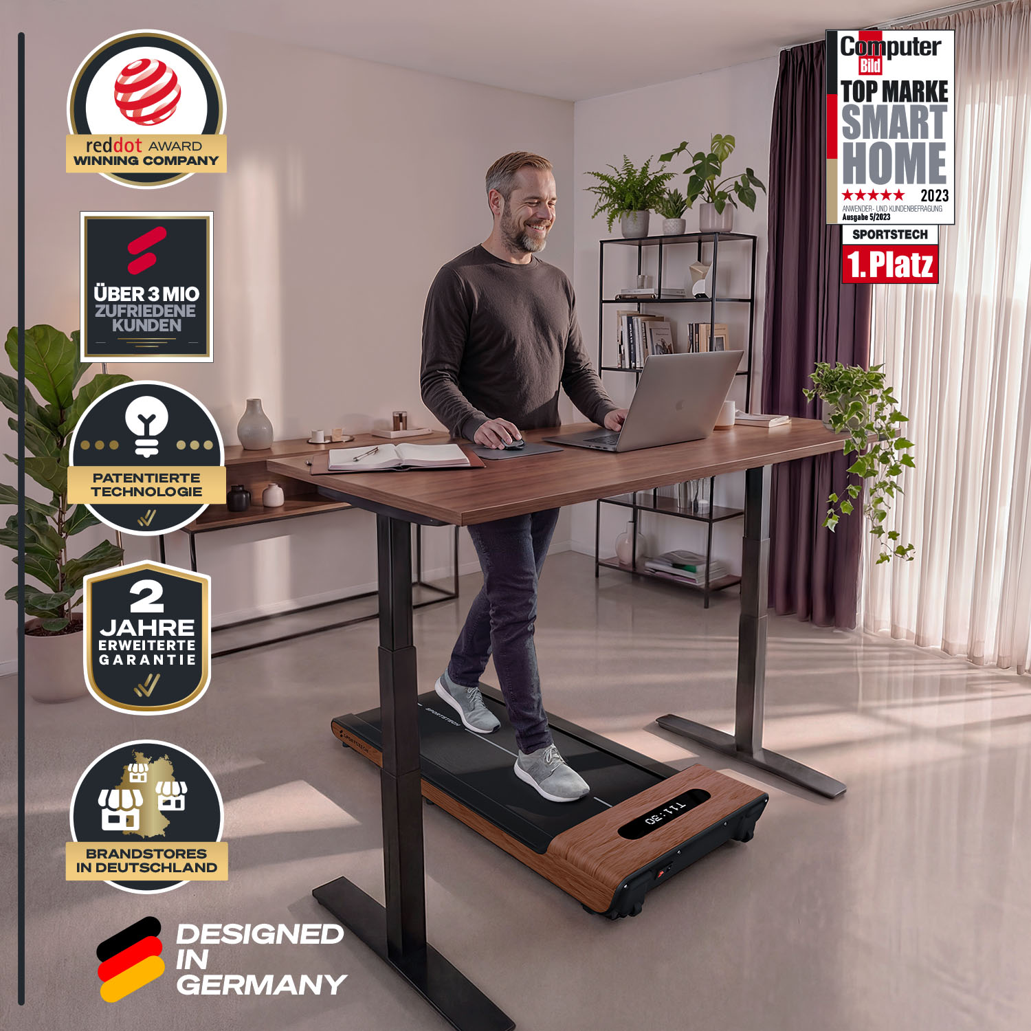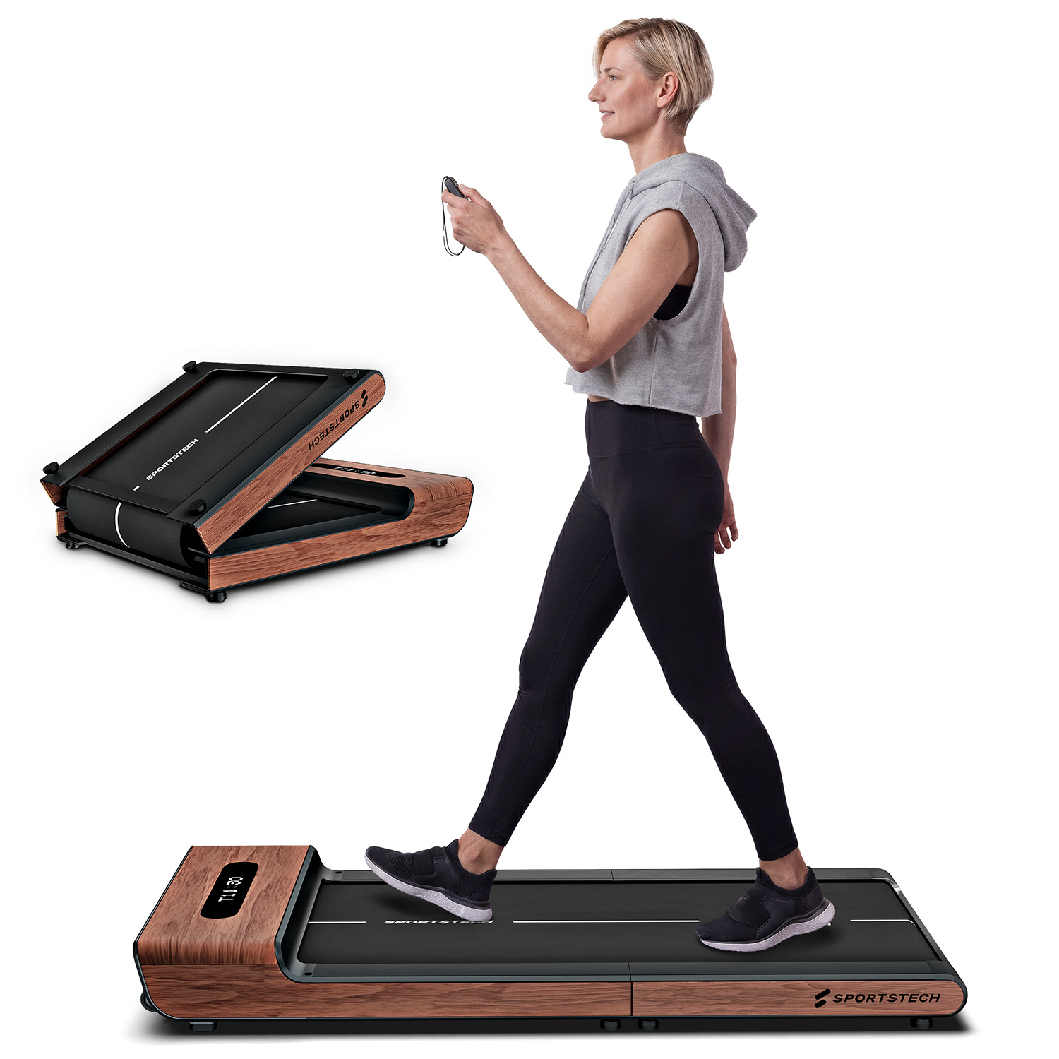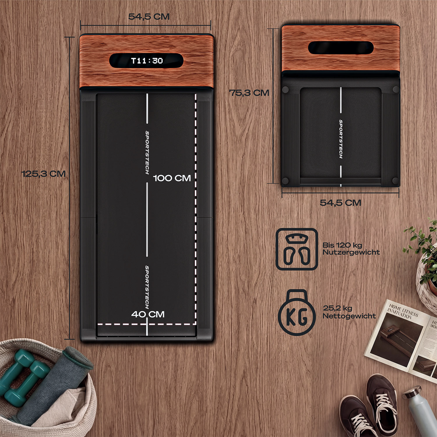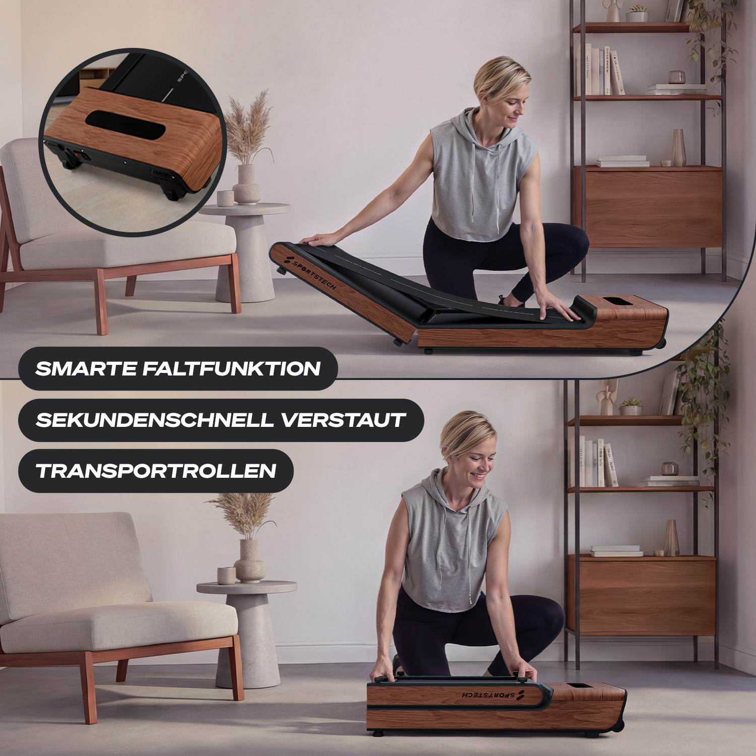 Das WoodPad Pro ist ein einzigartiges Walking Pad. Es sticht hervor durch seine edle Holzverarbeitung, seine Funktionalität und sein zeitloses Design. Du kannst es vielseitig einsetzen. Ob unterm Schreibtisch beim Arbeiten, oder Abends ein paar Schritte gehen vor dem Fernseher. Mit der integrierten Faltfunktion lässt es sich zudem mühelos verstauen und passt in jede Wohnung.