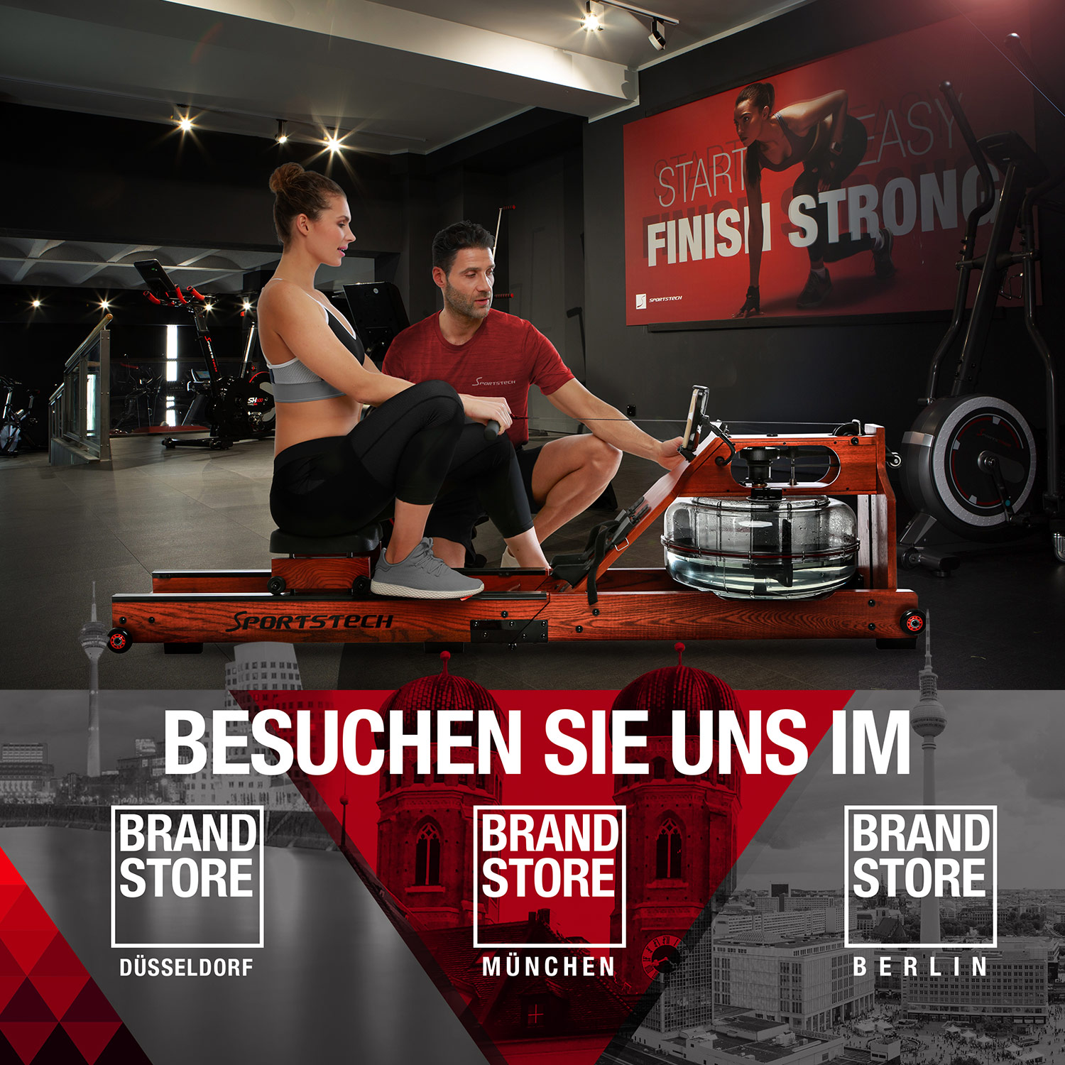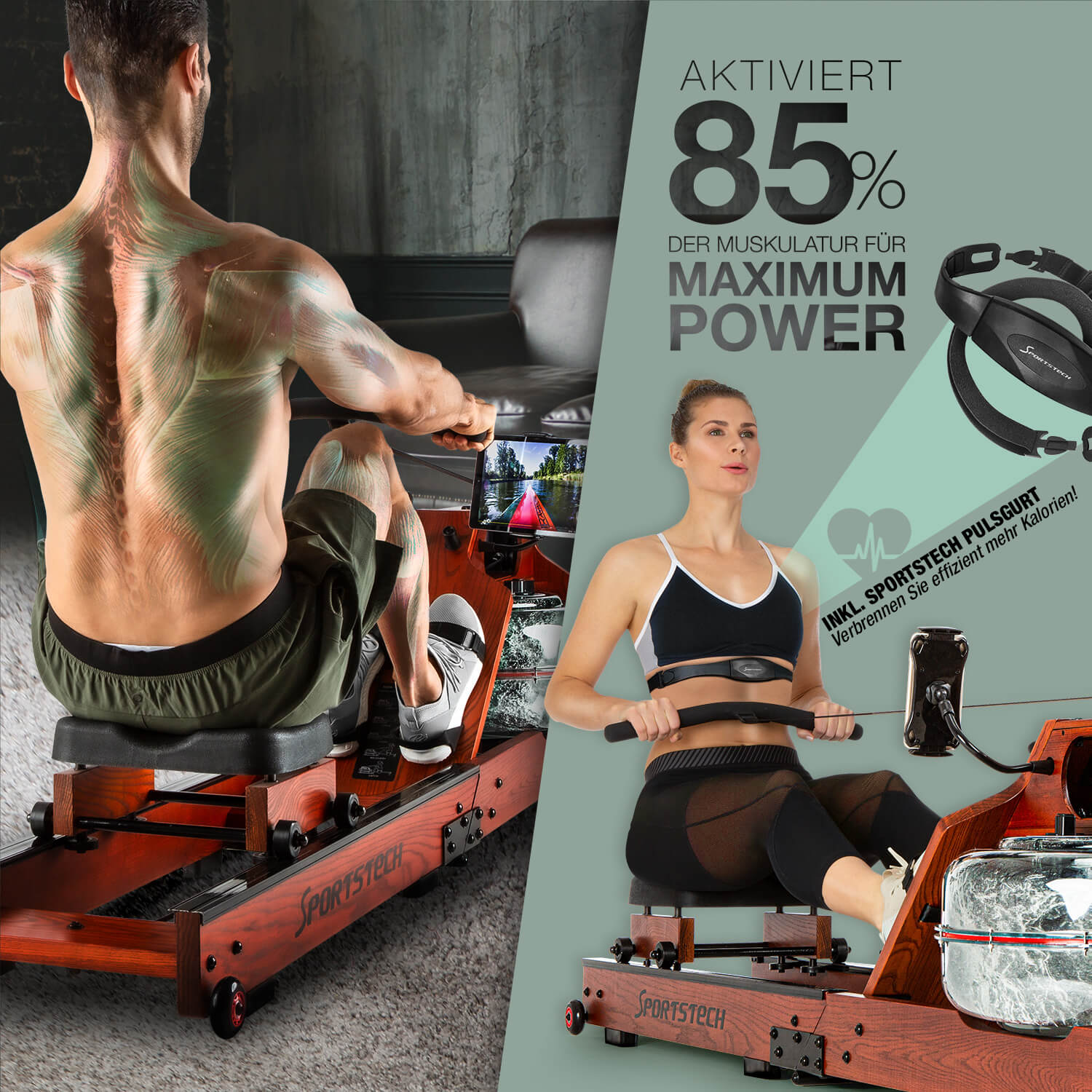 Das Wasserrudergerät ist für lange Workouts gebaut. Angefangen vom gelenkschonenden Wasserwiderstand über die ergonomische Sitzform mit Anti-Rutsch-Profil bis hin zu einstellbaren Fußpedalen sorgen SPORTSTECH Rudergeräte mit Wasser-Widerstand für rückenschonendes Training in optimaler Ruderposition.