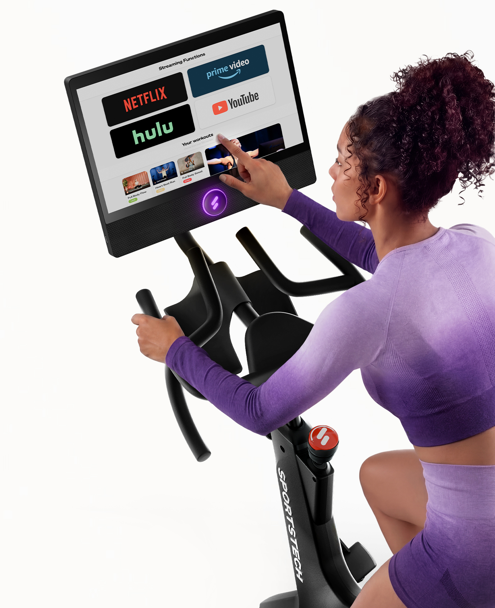 Der integrierte 21,5" HD-Touchscreen bietet dir Zugriff auf Workouts, smarte Trainingsmetriken, Challenges, Gamification, Community-Features und Streaming-Dienste wie Netflix und YouTube.