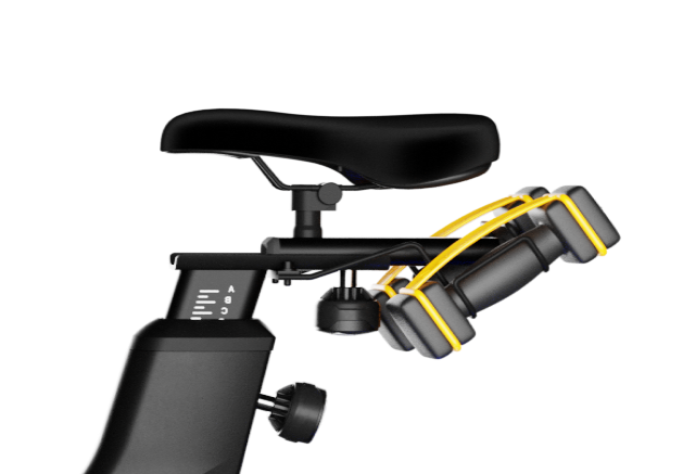 - Falls die Pedalen während des Trainings vom Schwungrad zu kräftig gedreht werden, drücken Sie den Bremsknauf unterhalb des Multipositionsgriffs nach unten: Das Schwungrad wird gebremst.
