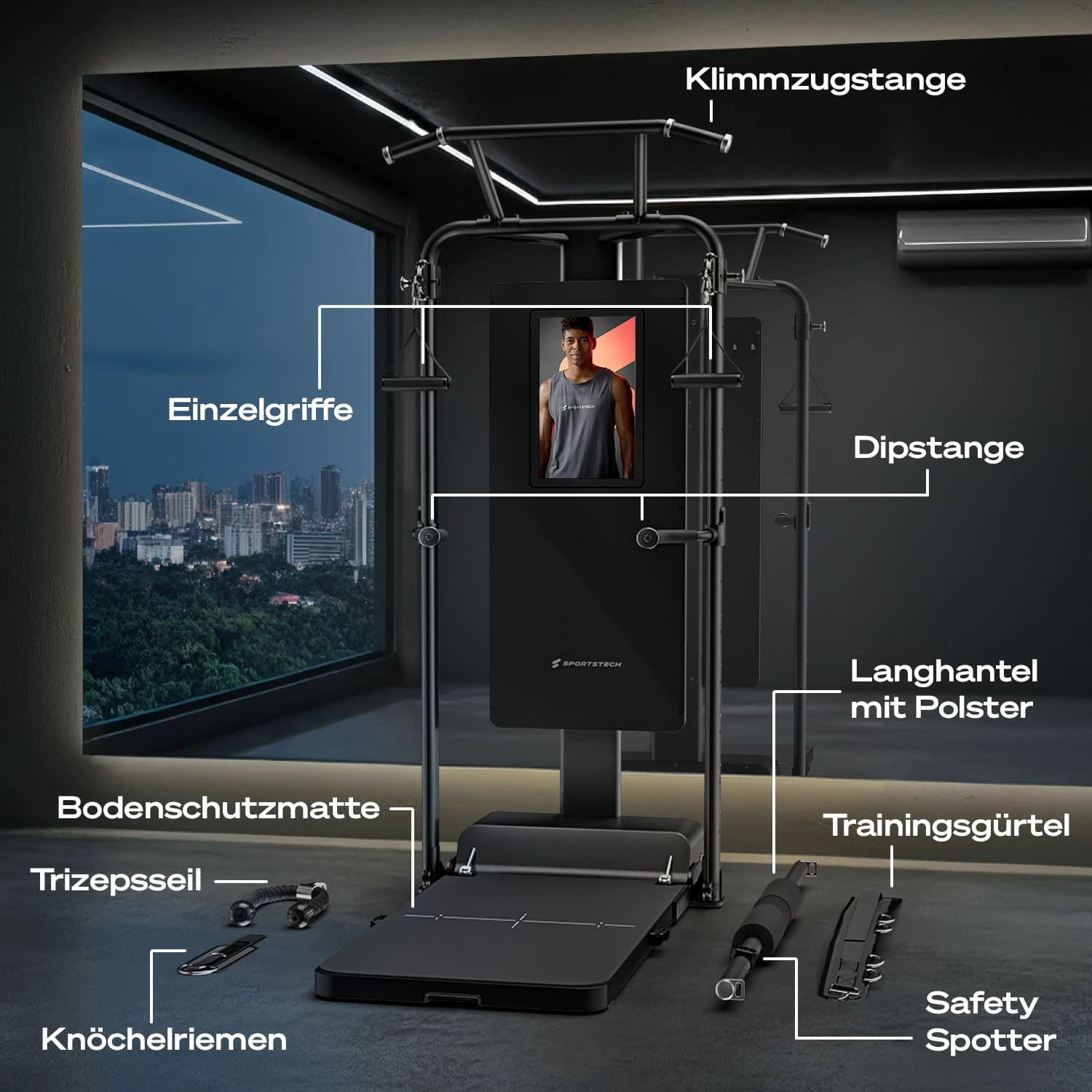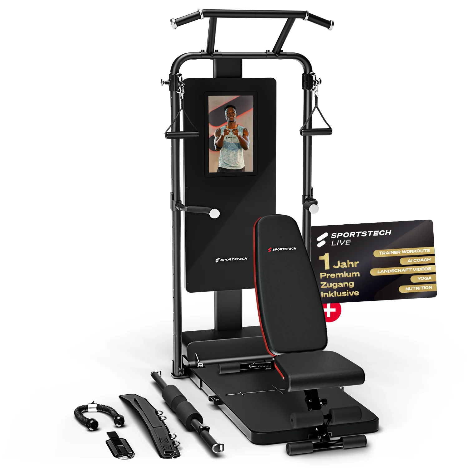 | Zubehör | Bodenschutzmatte, Safety Spotter, Klimmzugstange, Dipstange, Einzelgriffe, Extender Seile, Langhantel mit Polster, Trizepsseil, Trainingsgürtel, Knöchelriemen |